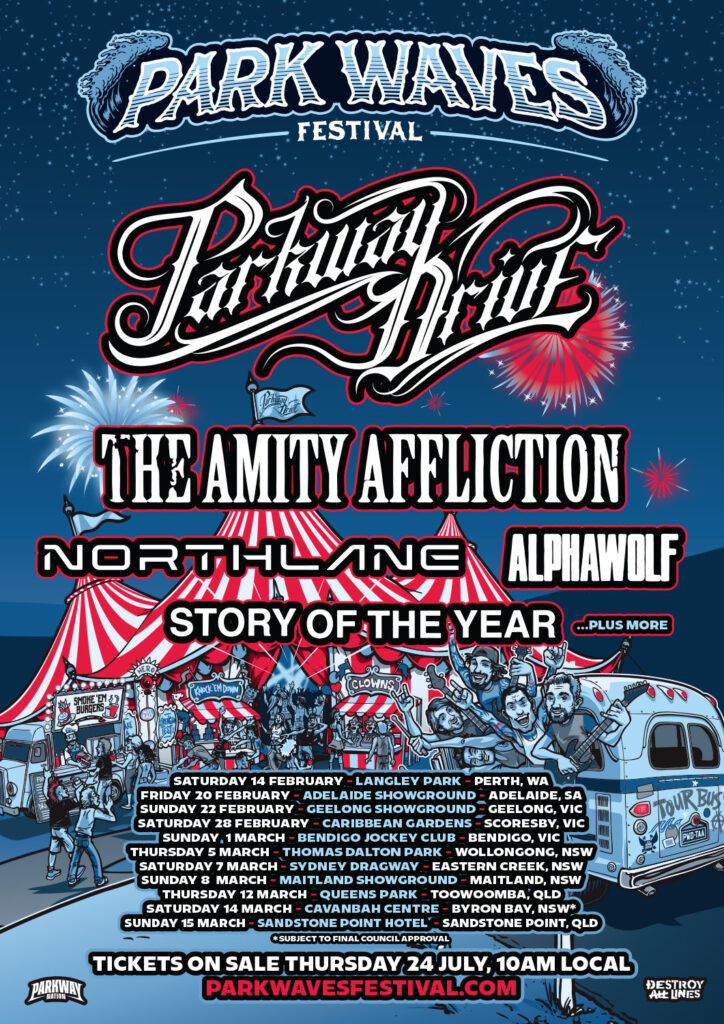 Headlined by PARKWAY DRIVE, the first ever Australian PARK WAVES also features a dazzling lineup of artists, including THE AMITY AFFLICTION, NORTHLANE, ALPHA WOLF and STORY OF THE YEAR. And adding to this Australian first, PARK WAVES will also mark the first time that PARKWAY DRIVE and THE AMITY AFFLICTION have ever toured Australia together in the collective history of both bands.