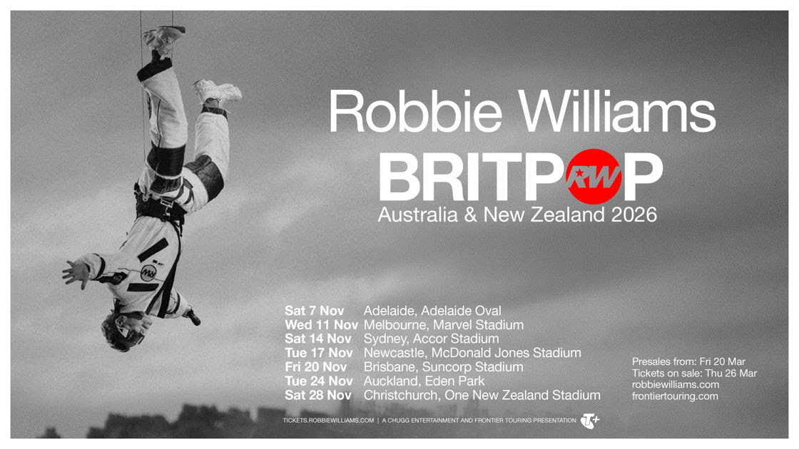In 2026, Robbie will gear up to perform some of his biggest AU-NZ shows ever, including cities he’s never before visited. The BRITPOP Tour will kick off at Adelaide Oval on Saturday 7 November, taking in Melbourne’s Marvel StadiumSydney’s Accor Stadium and Brisbane’s Suncorp Stadium plus a stop at Newcastle’s McDonald Jones Stadium for the very first time!
