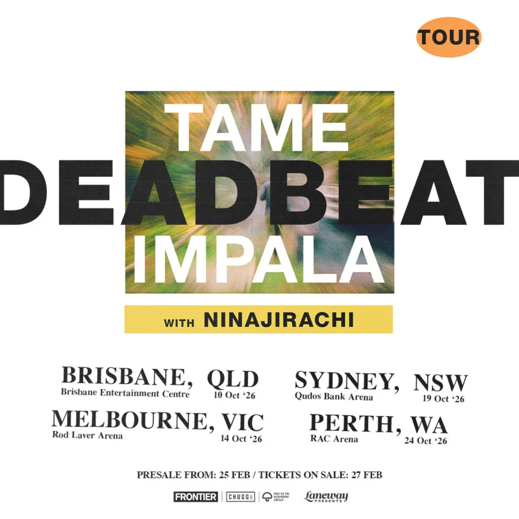 Kevin Parker has emerged as one of the most influential voices of the last decade. Marking a bold new musical chapter, Deadbeat (listen here) arrived in late 2025 led by three killer singles: ‘Loser’, ‘End of Summer’ and ‘Dracula’ – the latter earning Parker his biggest debuts yet at US radio, and landing in at number three on this year’s triple j’s Hottest 100, almost 20 years since Tame Impala’s first appearance in the poll. As a newly six-piece touring band, Tame Impala kicked off the Deadbeat tour with 12 sold-out shows across North America last October and November, with a UK/European tour set to begin this April. From July, Tame Impala will return to the USA and Canada, kicking off a huge area run featuring guests Djo and Dominic Fike.